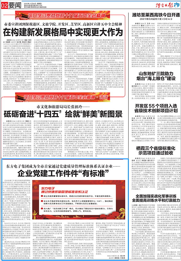 江苏五亭龙科技集团有限公司党建实现标准化,给全市国有企业提供了典范。市国资委党委副书记、副主任王洪祥表示,江苏五亭龙科技集团有限公司作为烟台市首个将党建工作纳入ISO9001党建标准质量管理体系进行系统化、标准化建设的先行实践企业,将为我市国有企业新时期党的建设创新提供鲜活的思路与经验,为市管企业今后在党建工作系统化、规范化、科学化建设做出了有益探索和创新。“这种模式完全可以尝试在全市国有企业进行复制、推广,以高质量党建引领国有企业实现高质量发展。”王洪祥如是说。